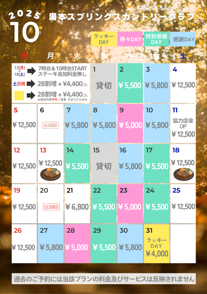 公式HP・LINE予約(9/15 11:00~)と電話予約限定(9/15 12:00~)で下記のプレー日を特別料金としております。