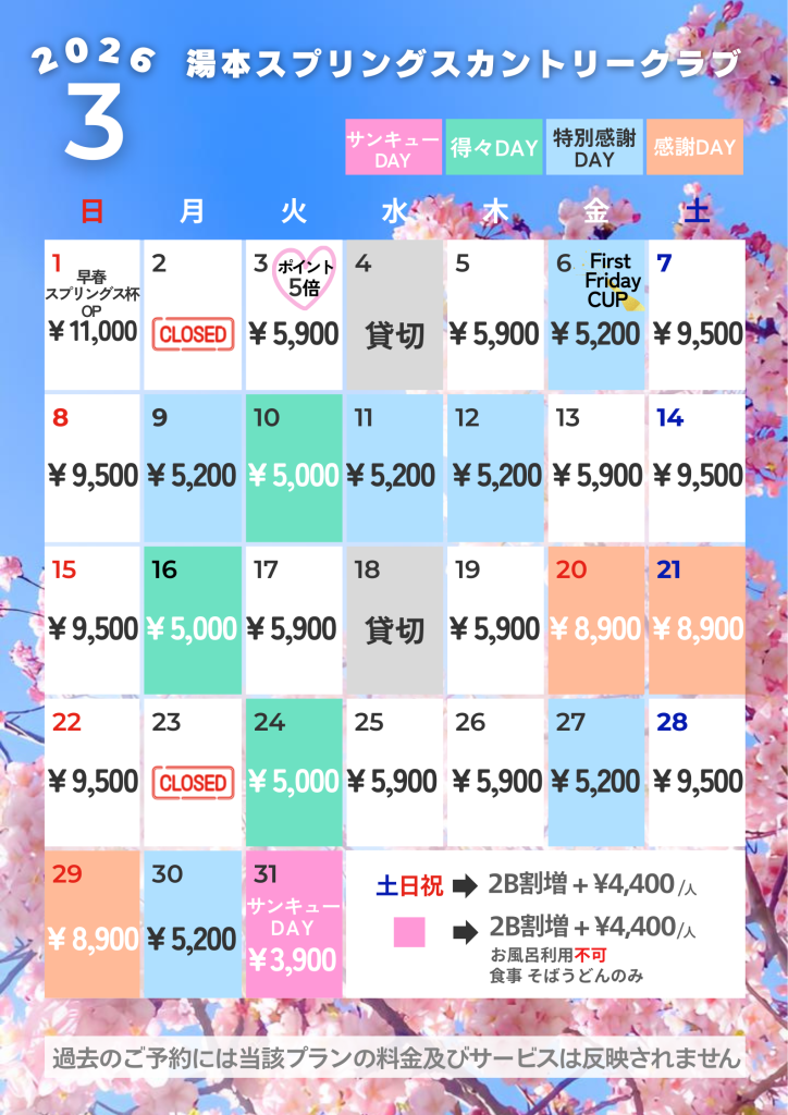 ※特別感謝Day等に付きましては、ご予約時のプレー料金となります。
